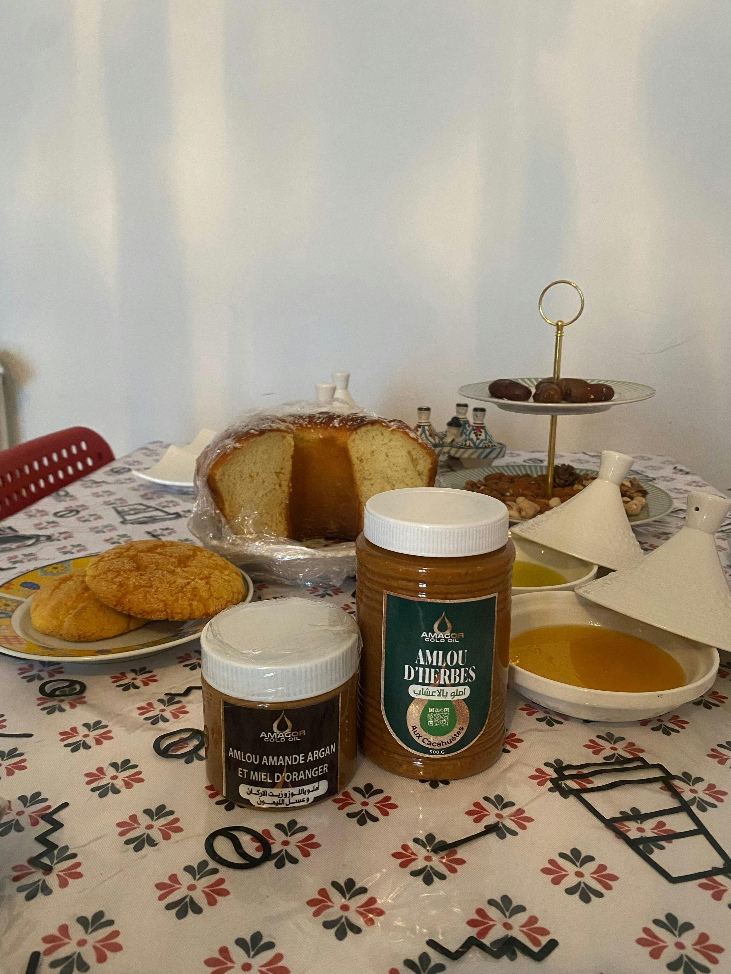 Découvrez l’Amlou aux amandes et miel d’oranger, une pâte à tartiner d’exception née au cœur du Souss, région mythique du Sud-Ouest marocain.